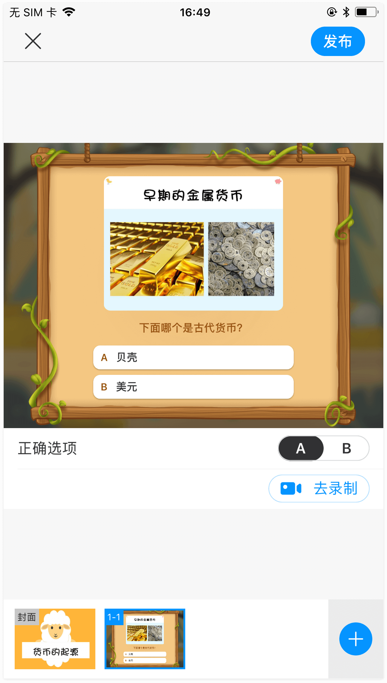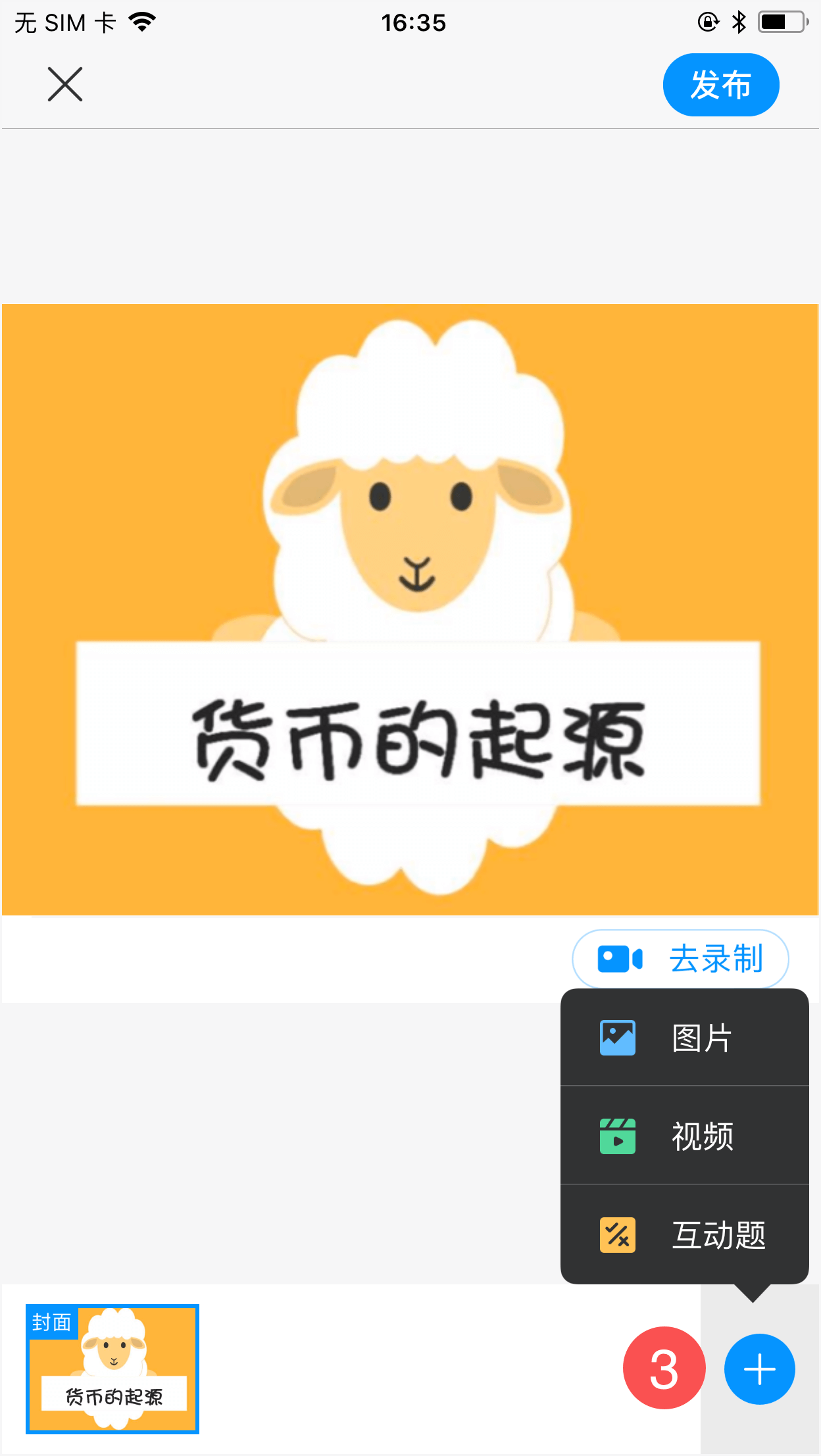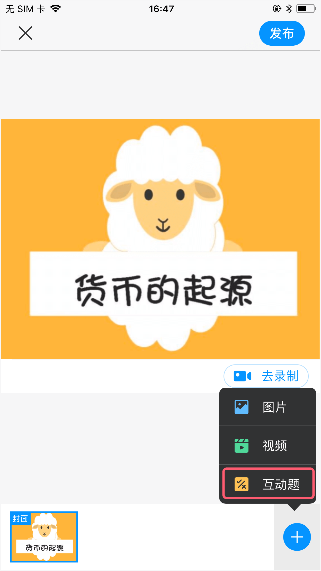 3. 然后点击底部的【加号】来选择需要添加的内容,可选择【图片】、【视频】、【互动题】
