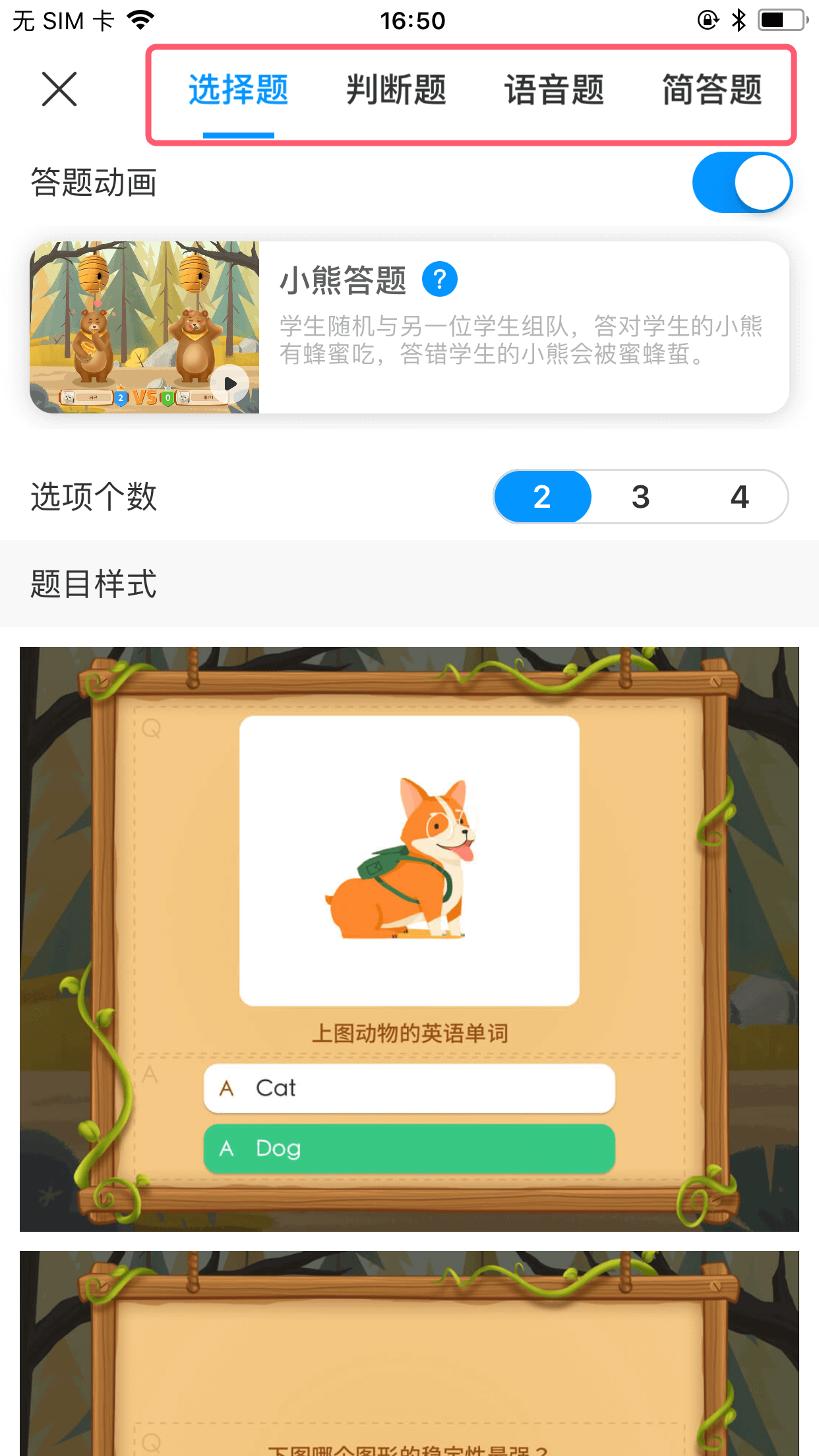 一共有选择题、判断题、语音题、问答题四种类型的题目,点击顶部的按钮可切换题型。