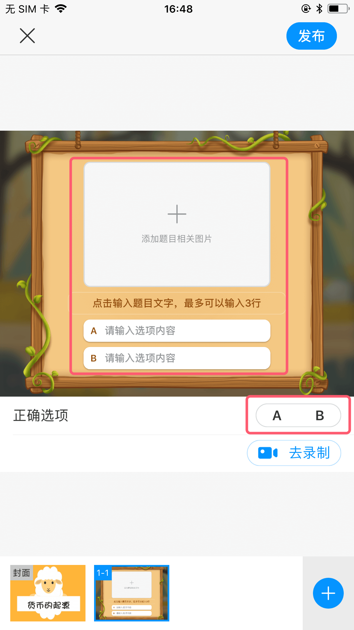2. 选择题目类型模板后回到创作页,需填写对题目的标题和选项并指定正确答案