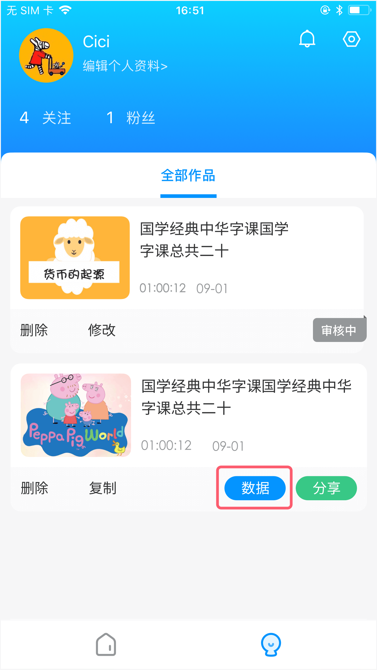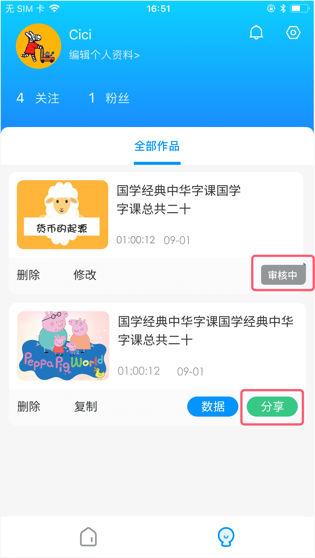 创作并发布作品后,可在“个人中心”页面查看作品的审核状态,只有审核通过的作品才能分享给别人。对于审核通过的作品,点击分享按钮,进入到微信分享界面,选择想要分享的微信联系人即可。